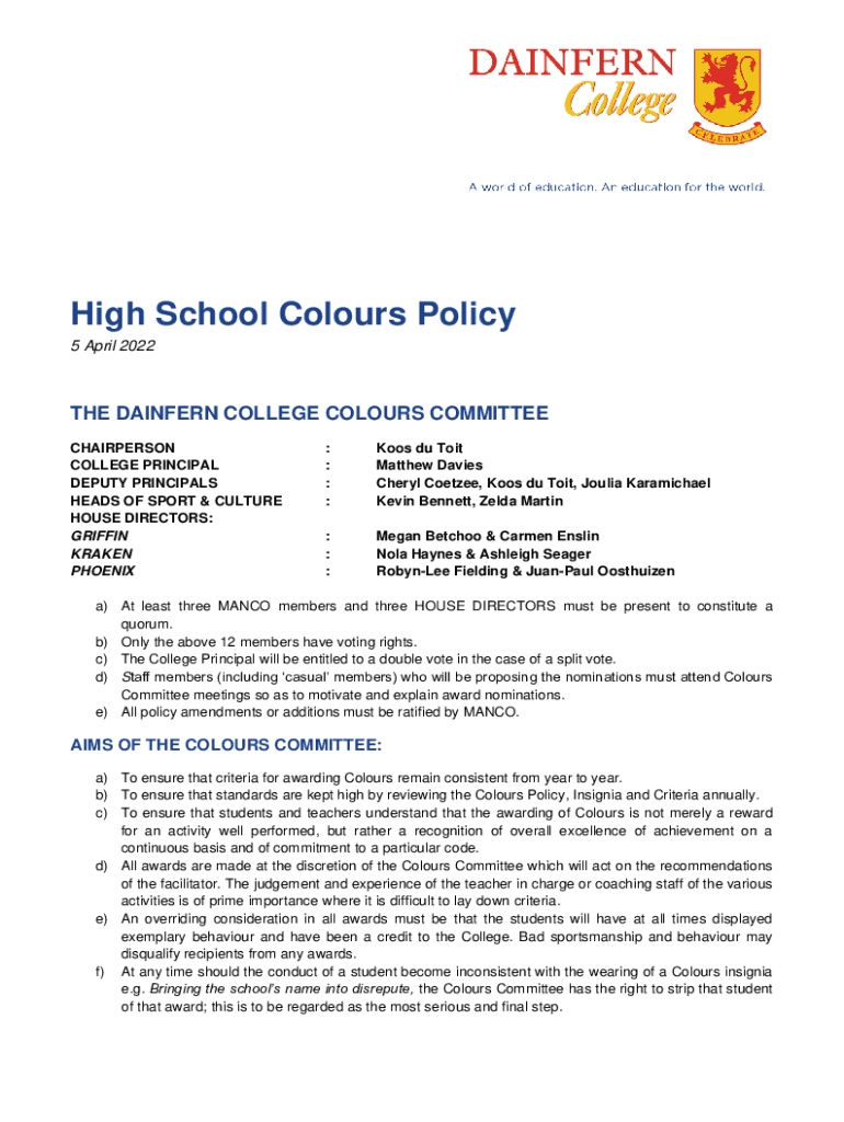 High School Colors Policy 5 April 2022THE DANGER COLLEGE Colors COMMITTEE CHAIRPERSON COLLEGE PRINCIPAL DEPUTY PRINCIPALS HEADS OF SPORT & CULTURE HOUSE DIRECTORS: GRIFFIN KRAKEN PHOENIX: : : :Zoos