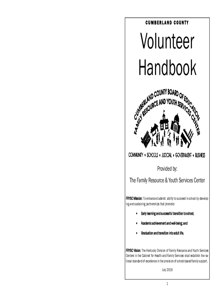 CUMBERLAND COUNTYVolunteer HandbookProvided by: The Family Resource & Youth Services Center FRY SC Mission: To enhance students ability to succeed in school by developing and sustaining partnerships