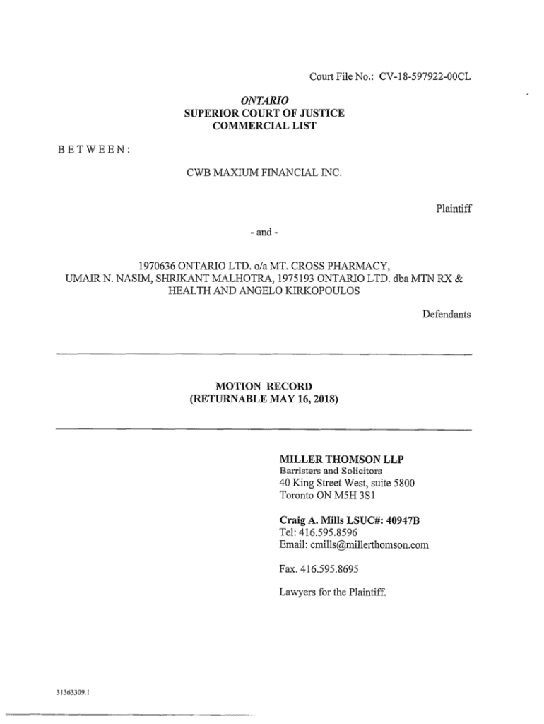 Court File No.: CV1859792200CL ONTARIO SUPERIOR COURT OF JUSTICE COMMERCIAL LIST BETWEEN: CWB MAXIMUM FINANCIAL INC. Plaintiff and 1970636 ONTARIO LTD. O/an MT. CROSS PHARMACY, UMA IR N. BASIS, SRIKANTH