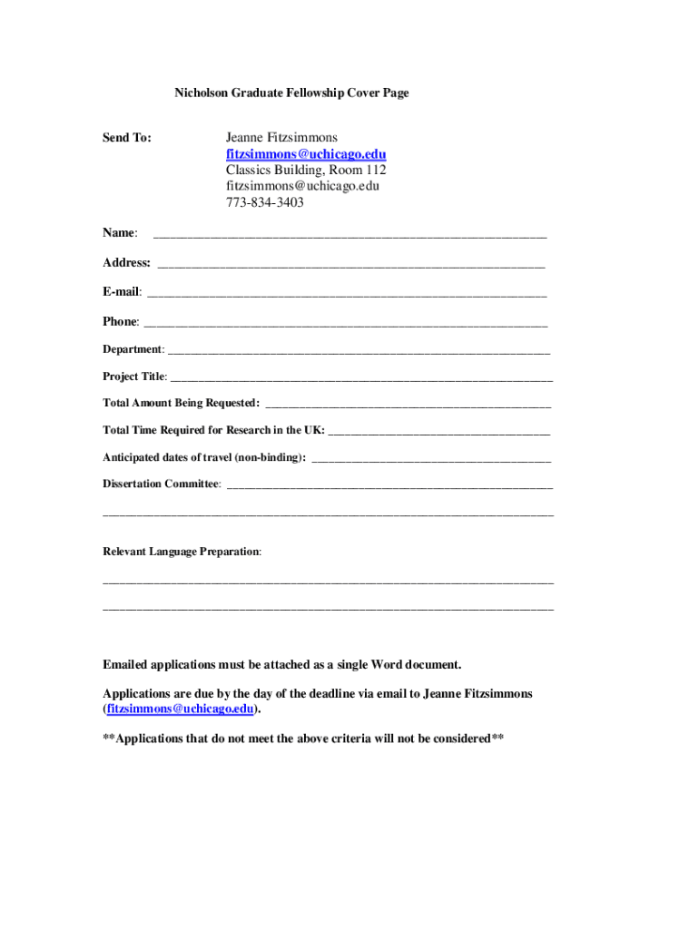 Nicholson Graduate Fellowship Cover Page Sends To:Name:Jeanne Fitzsimmons fitzsimmons@uchicago.edu Classics Building, Room 112 fitzsimmons@uchicago.edu 7738343403 ___Address: ___ Email: ___ Phone: