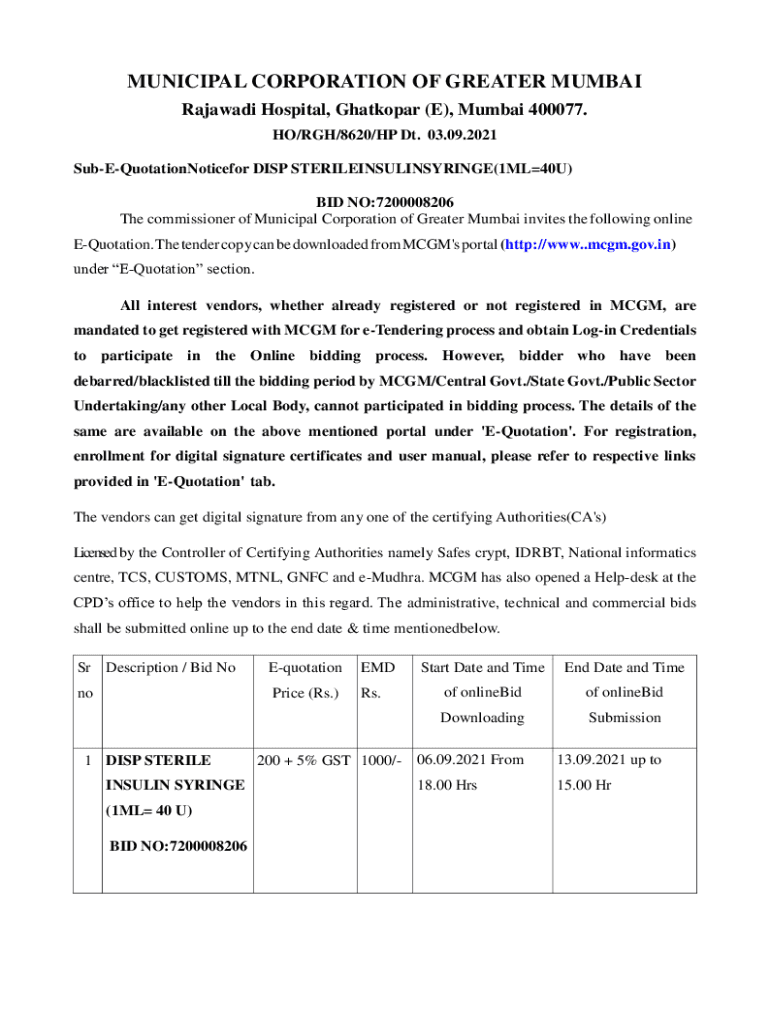 MUNICIPAL CORPORATION OF GREATER MUMBAI ATAWAD Hospital, Ghatkopar (E), Mumbai 400077. HO/GH/8620/HP DT. 03.09.2021 SubEQuotationNoticefor DISC STERILEINSULINSYRINGE(1ML40U) BID NO:7200008206 The