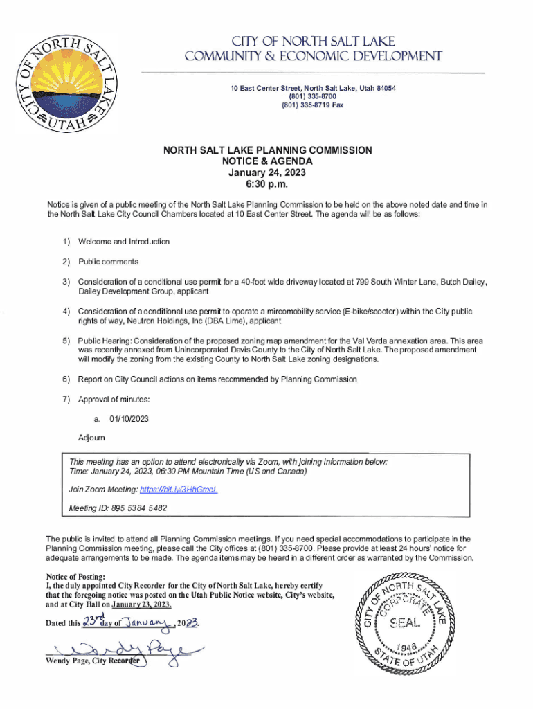 CITY OF NOR.TH SALT LAKE COMMUNITY & ECONOMIC DEVELOPMENT 10 East Center Street, North Salt Lake, Utah 84054 (801) 3358700 (801) 3358719 North SALT LAKE PLANNING COMMISSION NOTICE & AGENDA January