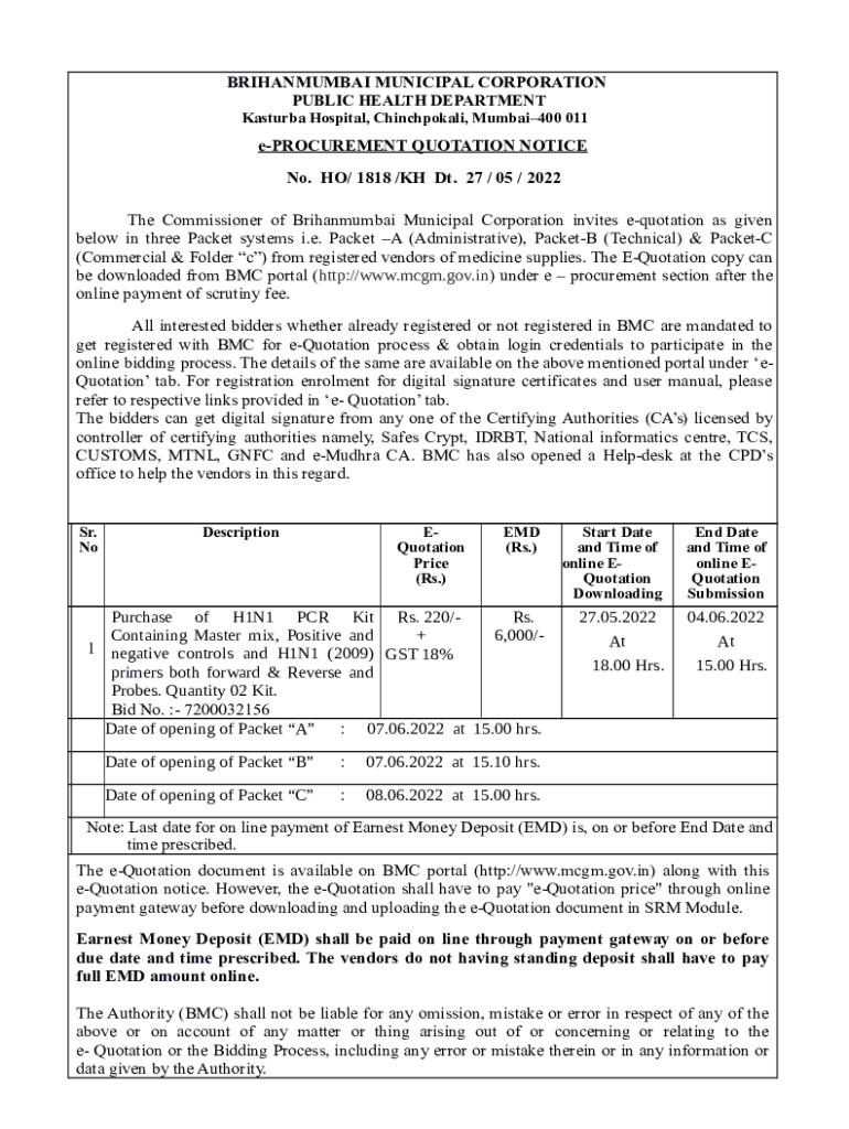 Pasture Hospital, Chinchpokali, Mumbai400 011ePROCUREMENT QUOTATION NOTICE