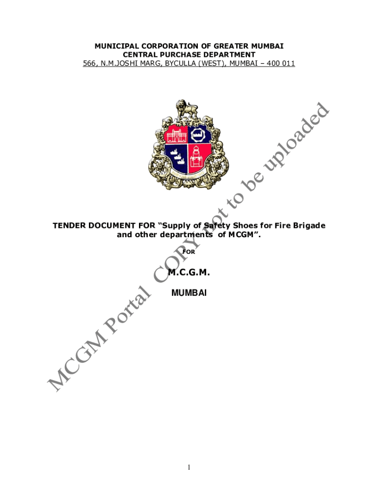 MUNICIPAL CORPORATION OF GREATER MUMBAI CENTRAL PURCHASE DEPARTMENT 566, N.M.JOSHI MARY, BULL (WEST), MUMBAI 400 011TENDER DOCUMENT FOR Supply of Safety Shoes for Fire Brigade and other departments