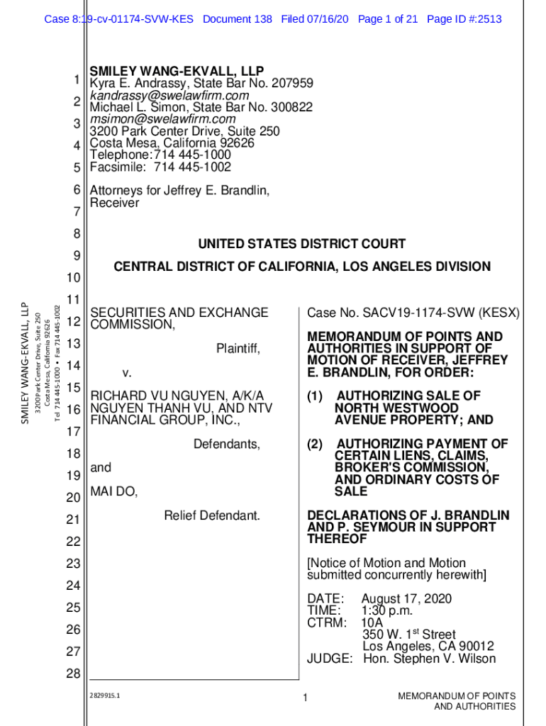 Case 8:19cv01174SVWKES Document 138 Filed 07/16/20-Page 1 of 21-Page ID #:2513SMILEY WANGEKVALL, LLP 1 Kyra E. Address, State Bar No. 207959 2 kandrassy@swelawfirm.com Michael L. Simon, State Bar