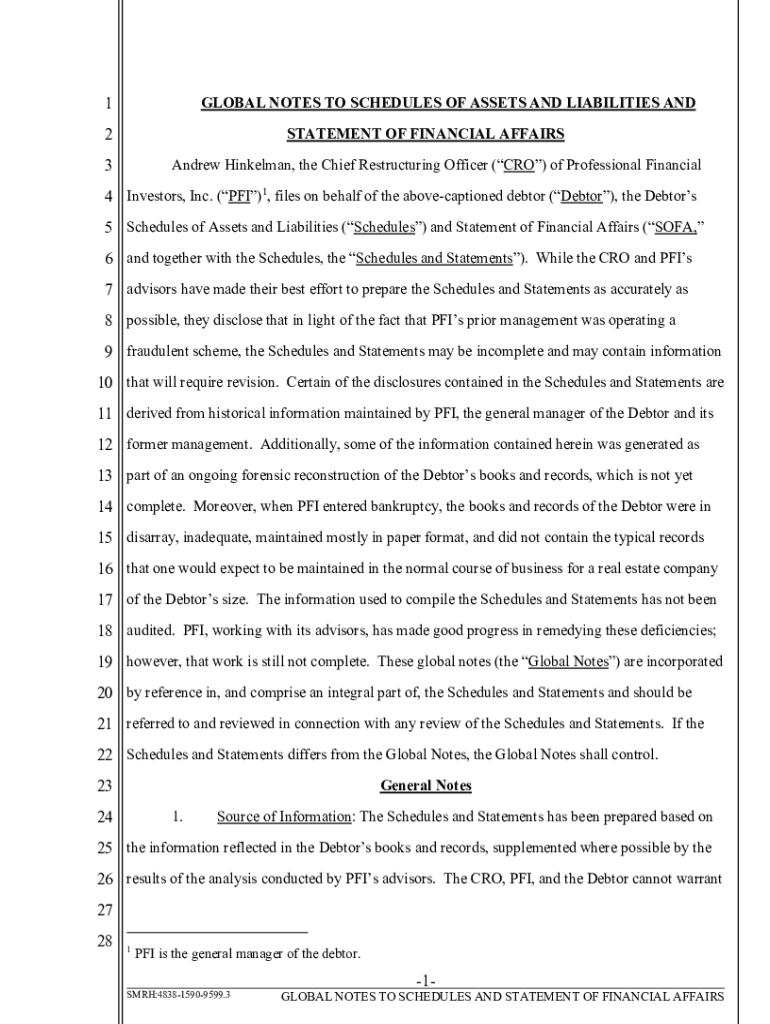 1GLOBAL NOTES TO SCHEDULES OF ASSETS AND LIABILITIES AND2STATEMENT OF FINANCIAL AFFAIRS3Andrew Lineman, the Chief Restructuring Officer (CRO) of Professional Financial4 Investors, Inc. (PCI)1, files