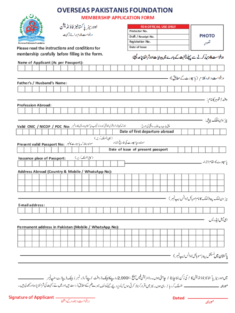 Any overseas Pakistani who wishes to become a member of the Overseas Pakistanis Foundation (OPF) is required to file this form.
