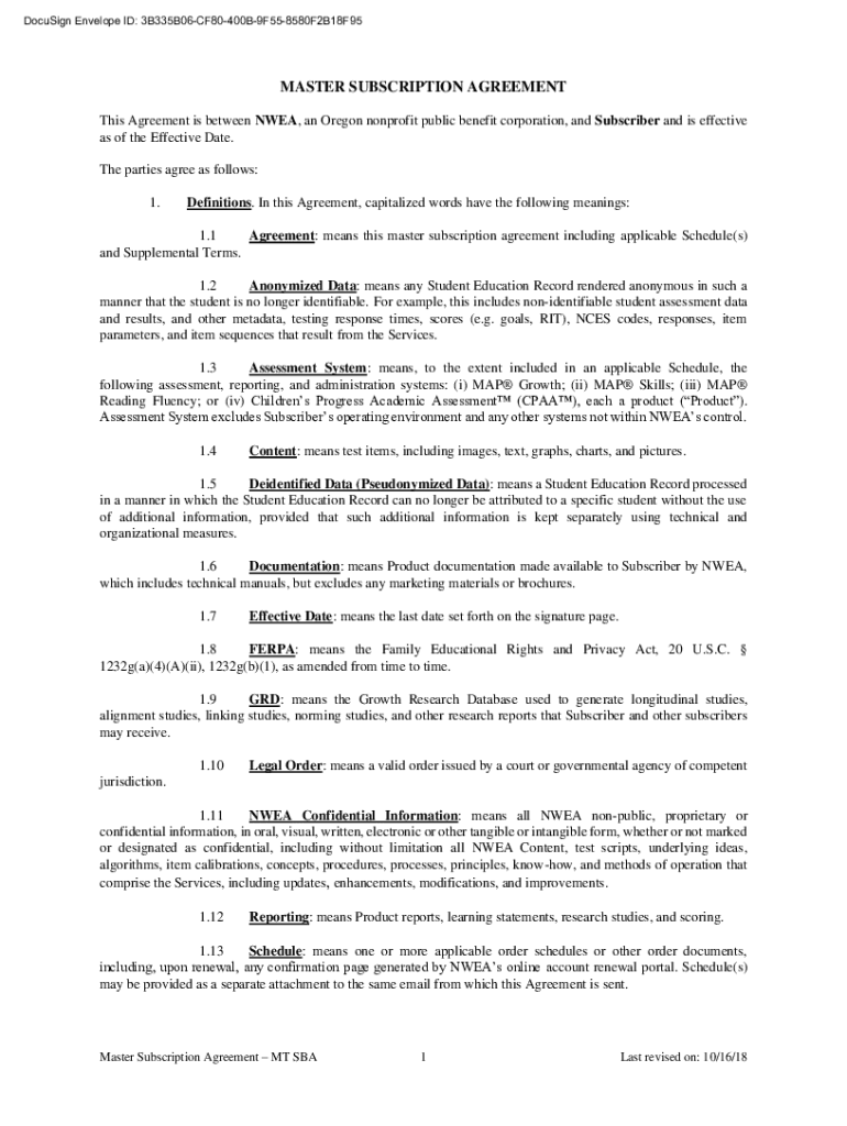 DocuSign Envelope ID: 3B335B06CF80400B9F558580F2B18F95MASTER SUBSCRIPTION AGREEMENT This Agreement is between NWEA, an Oregon nonprofit public benefit corporation, and Subscriber and is effective