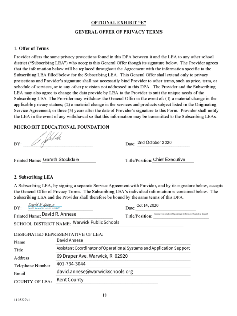OPTIONAL EXHIBIT E GENERAL OFFER OF PRIVACY TERMS 1. Offer of Terms Provider offers the same privacy protections found in this DPA between it and the LEA to any other school district (Subscribing