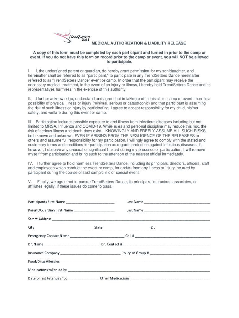 MEDICAL AUTHORIZATION & LIABILITY RELEASE A copy of this form must be completed by each participant and turned in prior to the camp or event. If you do not have this form on record prior to the camp