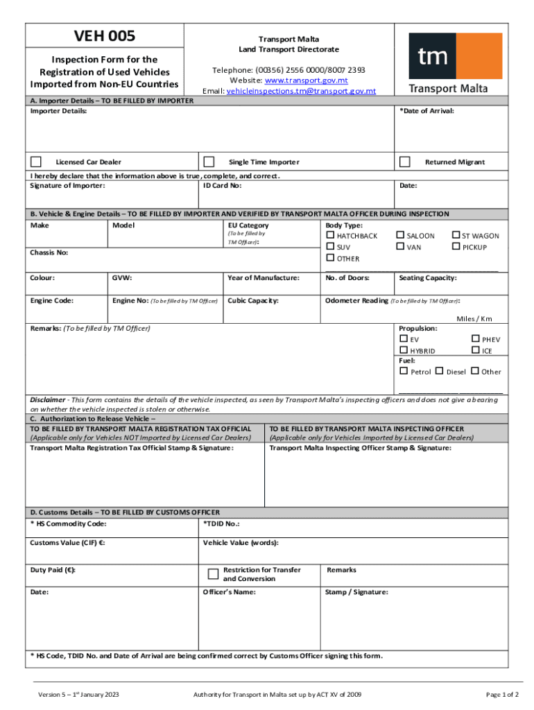 VH 005Transport Malta Land Transport DirectorateInspection Form for the Registration of Used Vehicles Imported from None CountriesTelephone: (00356) 2556 0000/8007 2393 Website: www.transport.gov.mt