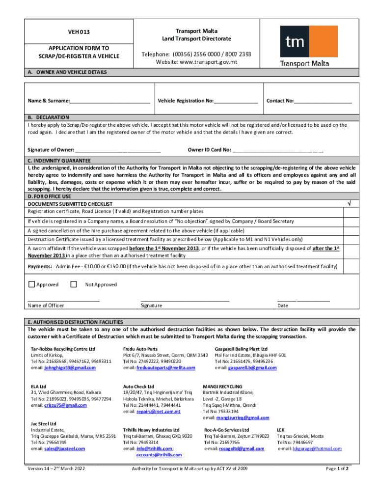 Transport Malta Land Transport Directorate 013 APPLICATION FORM TO SCRAP/DEREGISTER A VEHICLETelephone: (00356) 2556 0000 / 8007 2393 Website: www.transport.gov.mtA. OWNER AND VEHICLE DETAILSName