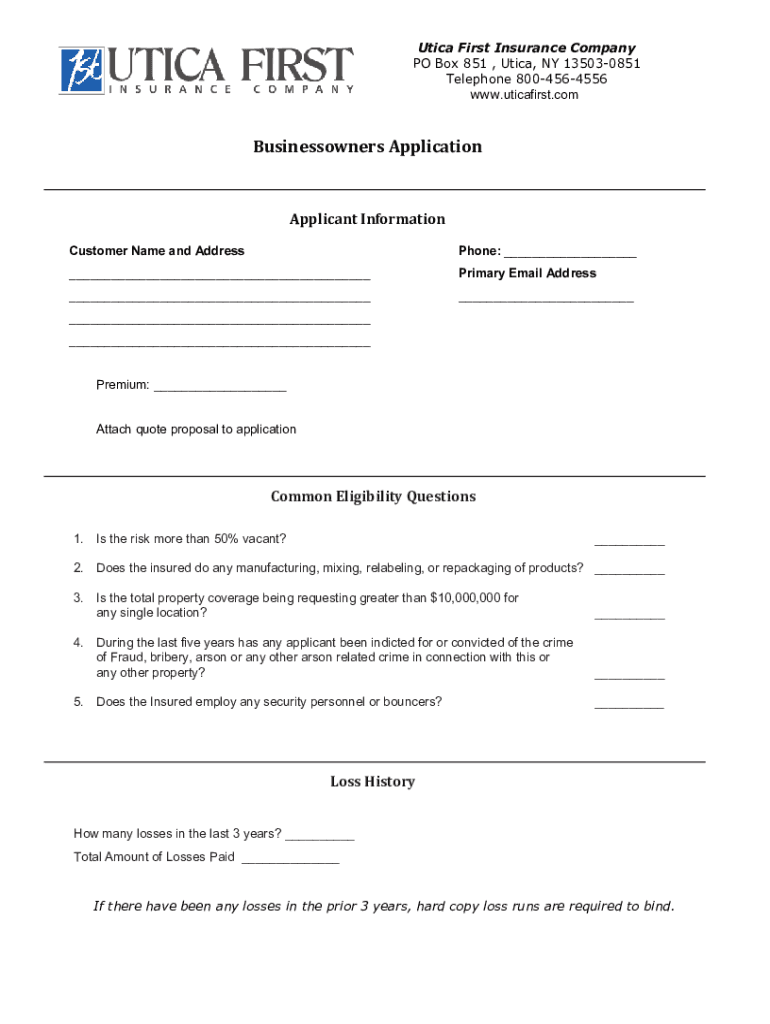 www.uticafirst.comBusinessowners ApplicationApplicant InformationCustomer Name and AddressPhone: ______Primary Email