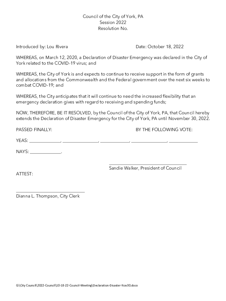 Council of the City of York, PA Session 2022 Resolution No. Introduced by: Lou Riverdale: October 18, 2022WHEREAS, on March 12, 2020, a Declaration of Disaster Emergency was declared in the City of