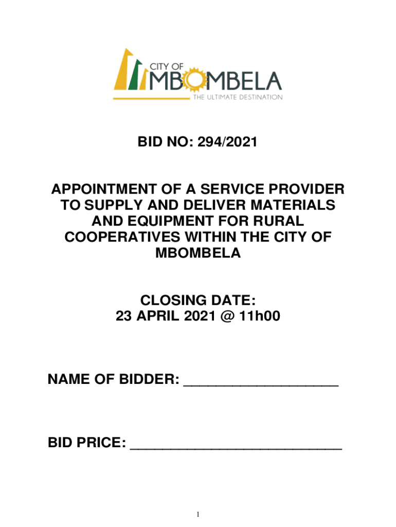 BID NO: 294/2021APPOINTMENT OF A SERVICE PROVIDER TO SUPPLY AND DELIVER MATERIALS AND EQUIPMENT FOR RURAL COOPERATIVES WITHIN THE CITY OF MBOMBELACLOSING DATE: 23 APRIL 2021 @ 11h00NAME OF BIDDER: