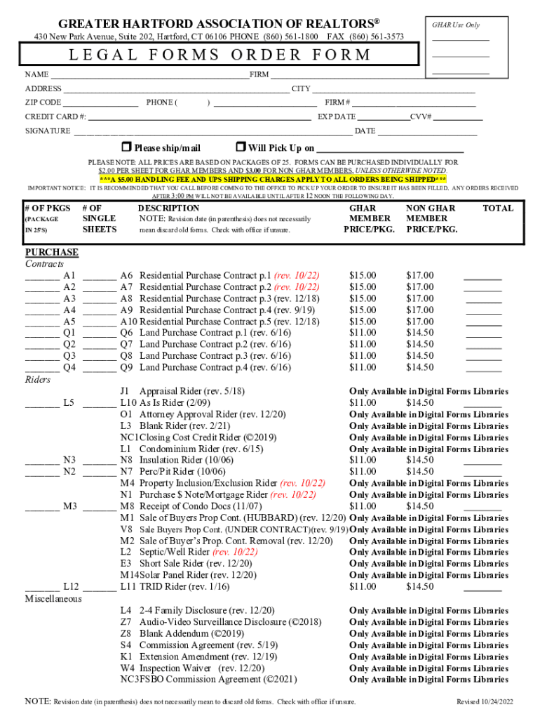 GREATER HARTFORD ASSOCIATION OF REALTORS430 New Park Avenue, Suite 202, Hartford, CT 06106 PHONE (860) 5611800GHAR Use Only FAX (860) 5613573LEGAL FORMS ORDER FORM NAME ___FIRM ___ ADDRESS ___ CITY