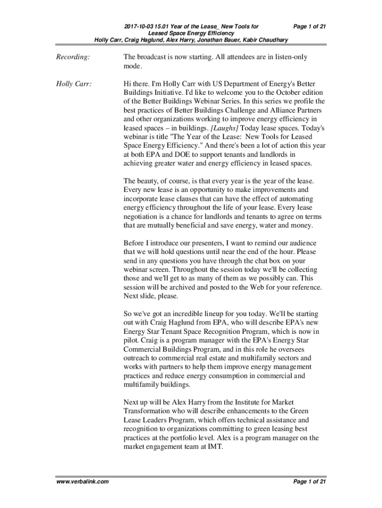 20171003 15.01 Year of the Lease_ New Tools for Page 1 of 21 Leased Space Energy Efficiency Holly Carr, Craig Haaland, Alex Harry, Jonathan Bauer, Air ChaudharyRecording:The broadcast is now starting.
