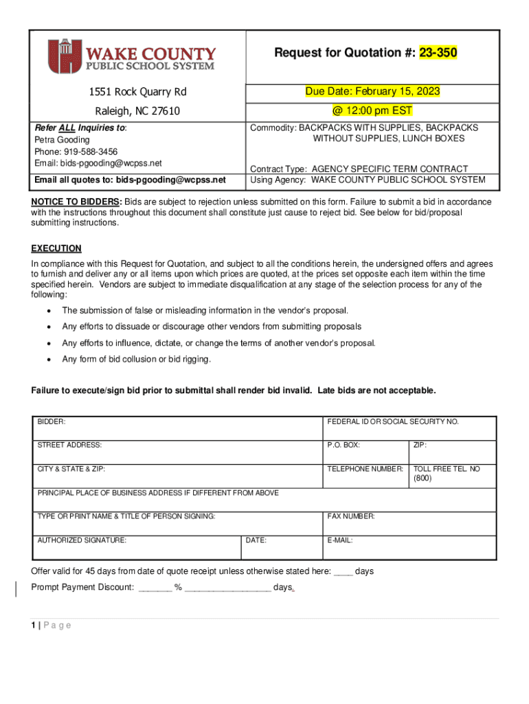 Get the free Request for Quotation #: 23-350 - webarchive wcpss