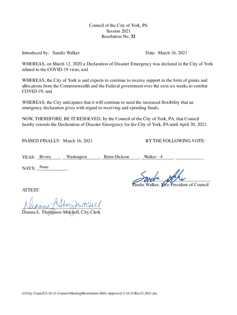 Council of the City of York, PA Session 2021 Resolution No. 32Introduced by: Sadie Alternate: March 16, 2021WHEREAS, on March 12, 2020, a Declaration of Disaster Emergency was declared in the City