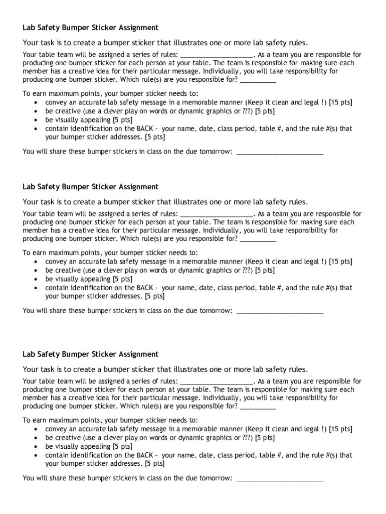 Lab Safety Bumper Sticker Assignment Your task is to create a bumper sticker that illustrates one or more lab safety rules. Your table team will be assigned a series of rules: ___. As a team you are