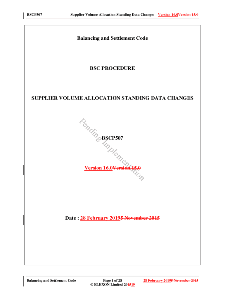 BSCP507Supplier Volume Allocation Standing Data Changes Version 16.0Version 15.0Balancing and Settlement Code BSC PROCEDURESUPPLIER VOLUME ALLOCATION STANDING DATA Changes din PE gBSCP507tio ta exemplify