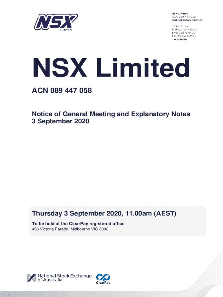 NSW Limited ACN 089 447 058 Notice of General Meeting and Explanatory Notes 3 September 2020Thursday 3 September 2020, 11.00am (AEST) To be held at the Clearway registered office 456 Victoria Parade,