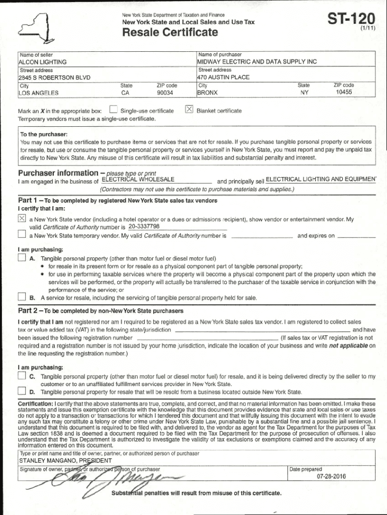 ST120New York State Department of Taxation and Finance York State and Local Sales and Use Resale Certificate