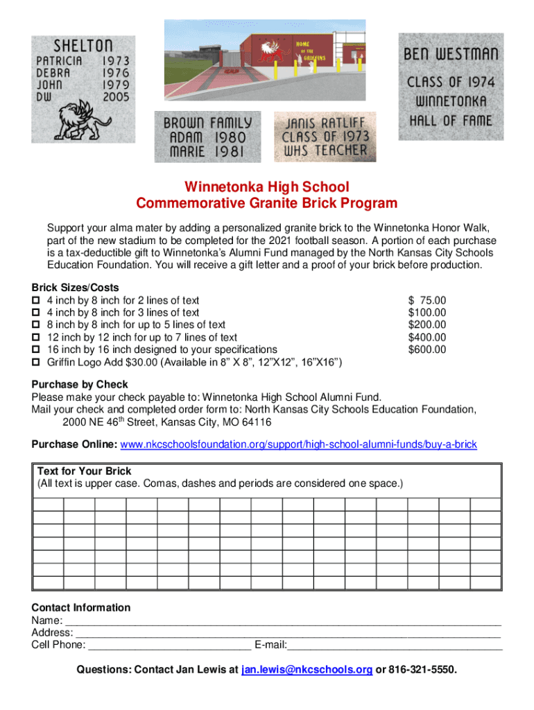 Minnetonka High School Commemorative Granite Brick Program Support your alma mater by adding a personalized granite brick to the Minnetonka Honor Walk, part of the new stadium to be completed for