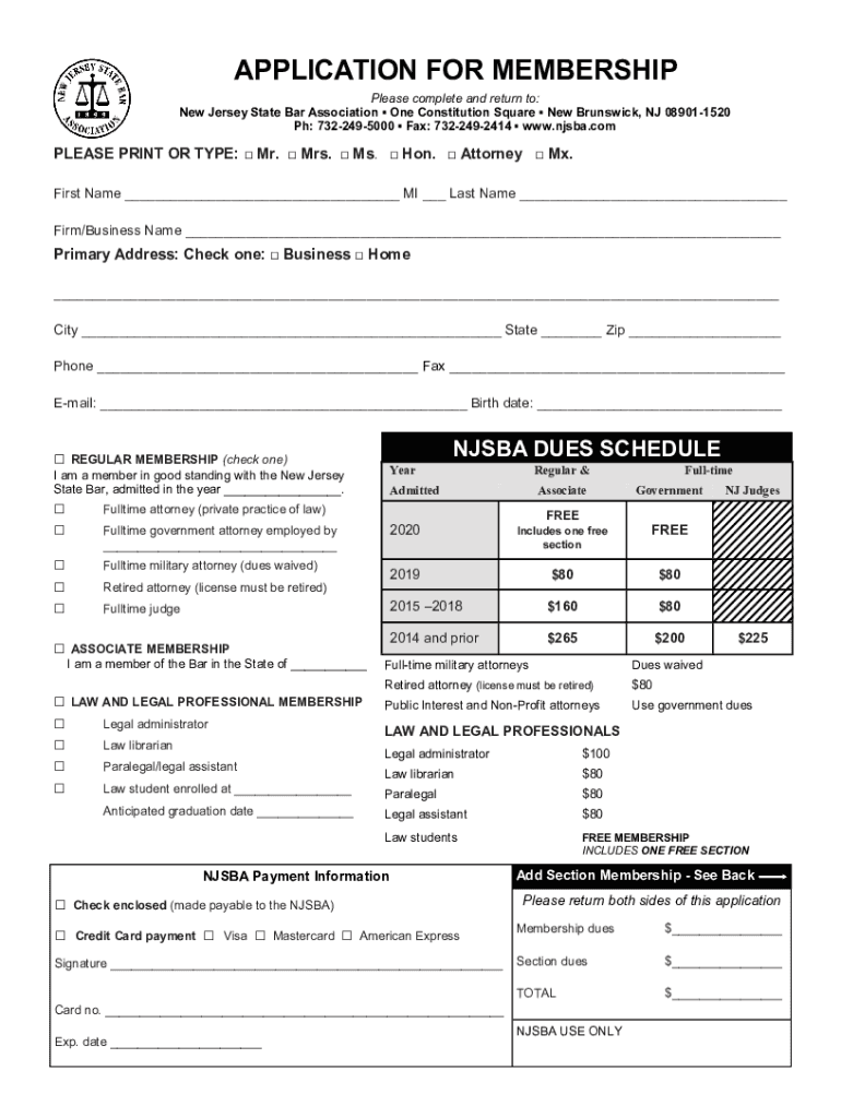 APPLICATION FOR MEMBERSHIP Please complete and return to: New Jersey State Bar Association One Constitution Square New Brunswick, NJ 089011520 pH: 7322495000 Fax: 7322492414 www.njsba.comPLEASE PRINT