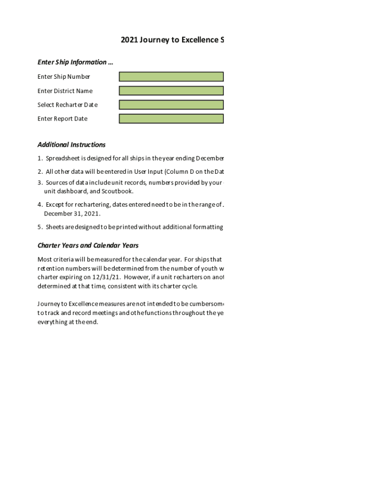 2021 Journey to Excellence Ship Spreadsheet Enter Ship Information Enter Ship Number Enter District Name Select Recharter Date Enter Report DateAdditional Instructions 1. Spreadsheet is designed for