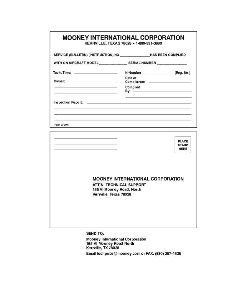 MOONEY INTERNATIONAL CORPORATION KERRVILLE, TEXAS 78028 18003313880SERVICE (BULLETIN) (INSTRUCTION) NO.___HAS BEEN COMPLIED WITH ON AIRCRAFT MODEL ___ SERIAL NUMBER ___ Each. Time:NNumberOwner:Date