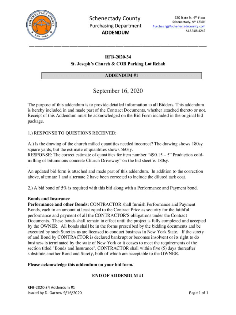 Schenectady County Purchasing Department ADDENDUM620 State St.6th Floor Schenectady, NY 12305 Purchasing@schenectadycounty.com 518.388.4242___ RFB202034 St. Josephs Church & COB Parking Lot Rehab