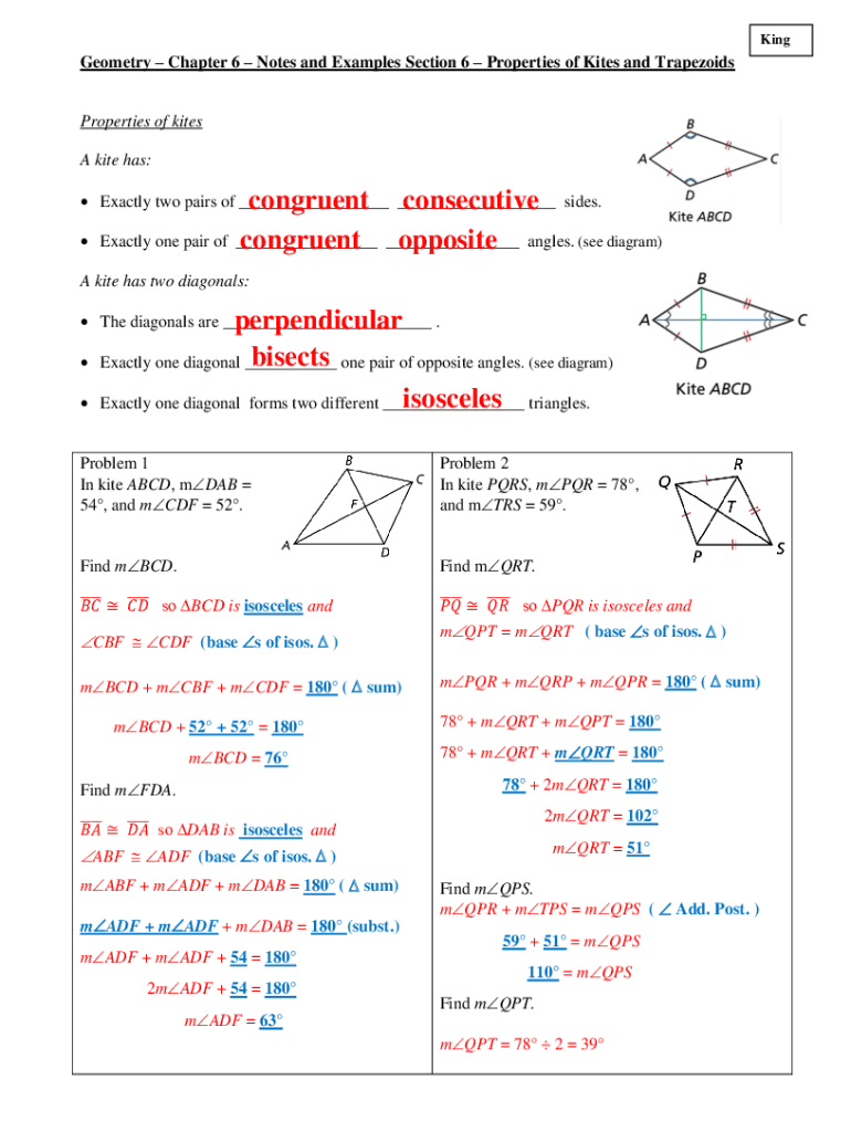 KingGeometry Chapter 6 Notes and Examples Section 6 Properties of Kites and TrapezoidsProperties of kites A kite has: Exactly two pairs of ___ ___ sides. Congruent consecutive Exactly one pair of