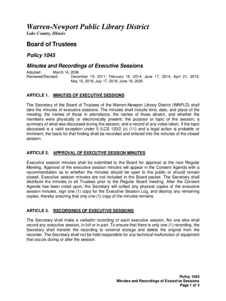 Warren Newport Public Library District Lake County, IllinoisBoard of Trustees Policy 1045 Minutes and Recordings of Executive Sessions Adopted: March 14, 2006, Reviewed/Revised: December 19, 2011;