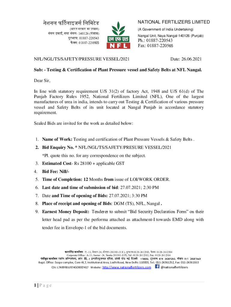 Get the free NOTICE INVITING TENDER - National Fertilizers Limited