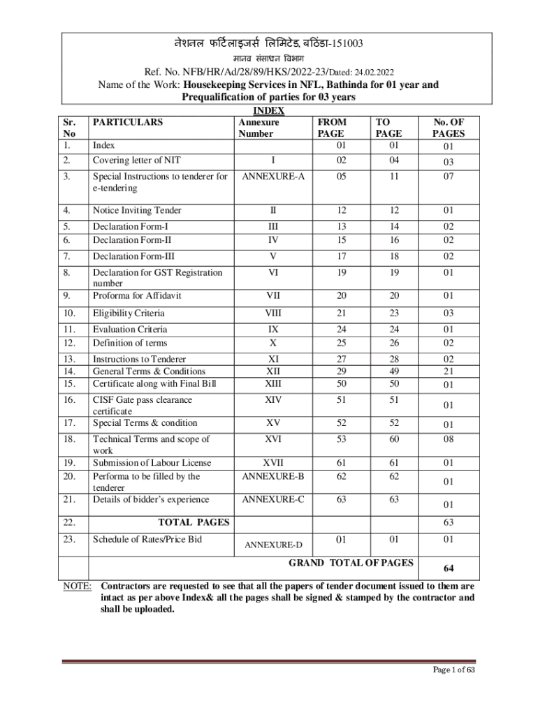 , 151003 Refs. No. NFL/HR/Ad/28/89/HIS/202223/Dated: 24.02.2022 Name of the Work: Housekeeping Services in NFL, Bathing for 01 year and Prequalification of parties for 03 years Sr. No 1. 2.PARTICULARS3.