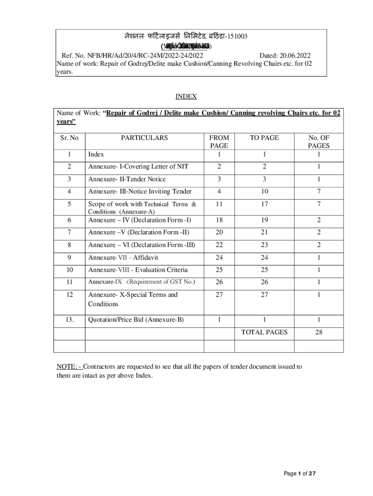 , 151003 () Ref. No. NFL/HR/Ad/20/4/RC24M/202224/2022 Dated: 20.06.2022 Name of work: Repair of Gore/Elite make Cushion/Canning Revolving Chairs etc. for 02 years. INDEX Name of Work: Repair of Gore