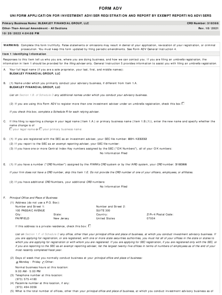 FORM ADV UNIFORM APPLICATION FOR INVESTMENT ADVISER REGISTRATION AND REPORT BY EXEMPT REPORTING ADVISERS Primary Business Name: BLEAKLY FINANCIAL GROUP, LLC CRD Number: 318366OtherThanAnnual Amendment