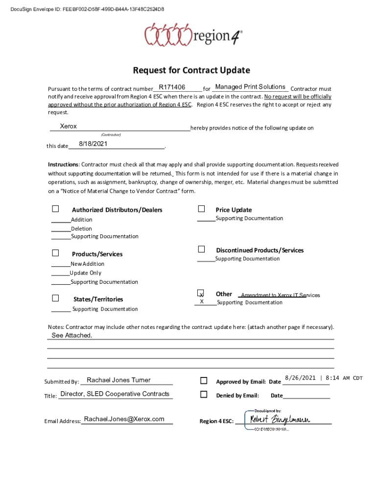 DocuSign Envelope ID: FEEBF002D58F499DB44A13F48C2524D8Request for Contract Update Managed Print Solutions Contractor must R171406 Pursuant to the terms of contract number___ for ___ notify and receive