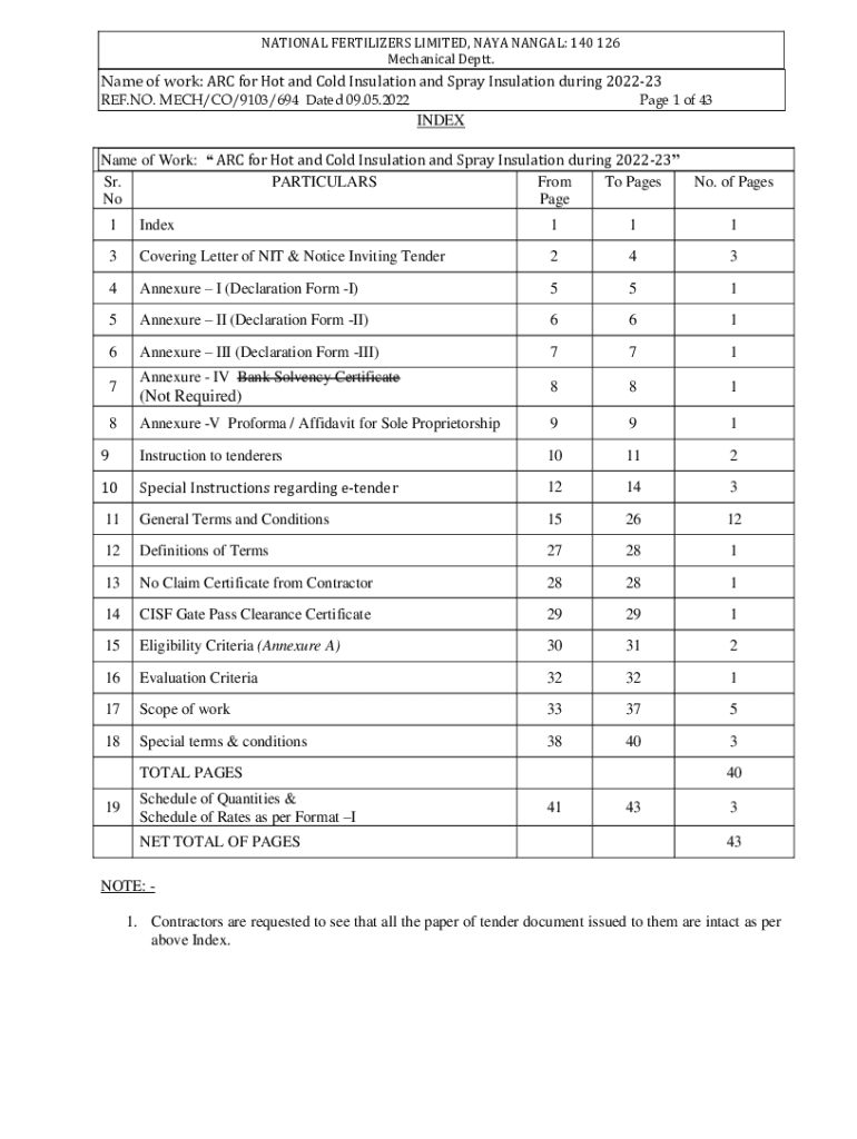 NATIONAL FERTILIZERS LIMITED, NASA NAVAL: 140 126 Mechanical Depth. Name of work: ARC for Hot and Cold Insulation and Spray Insulation during 202223 REF.NO. MUCH/CO/9103/694 Dated 09.05.2022Page 1