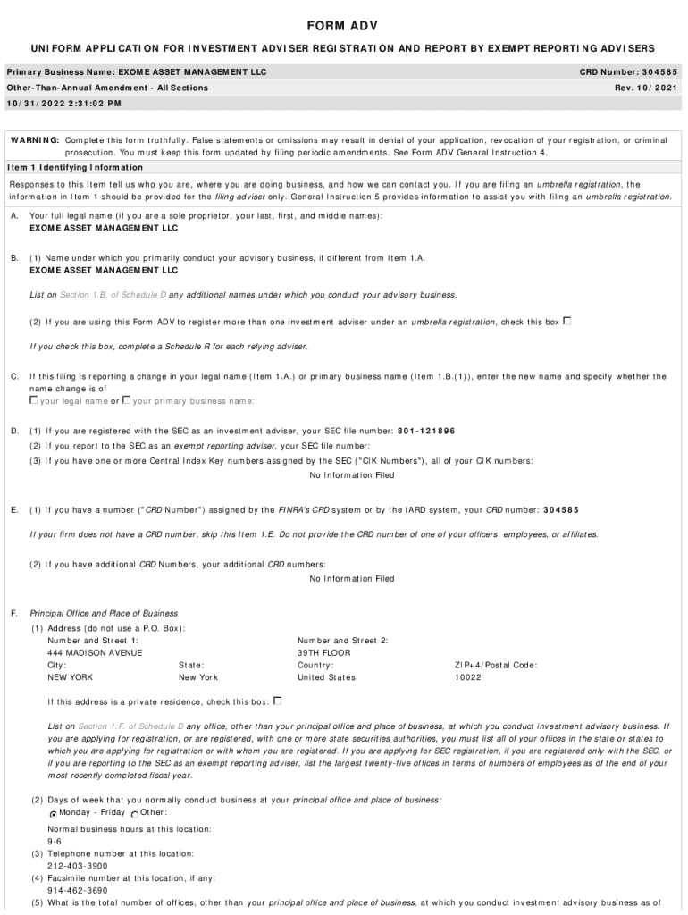 FORM ADV UNIFORM APPLICATION FOR INVESTMENT ADVISER REGISTRATION AND REPORT BY EXEMPT REPORTING ADVISERS Primary Business Name: SOME ASSET MANAGEMENT LLC CRD Number: 304585OtherThanAnnual Amendment