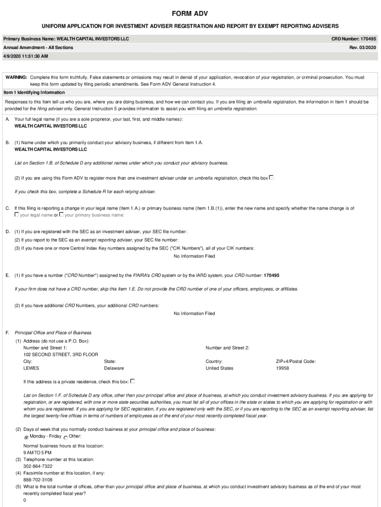 FORM ADV UNIFORM APPLICATION FOR INVESTMENT ADVISER REGISTRATION AND REPORT BY EXEMPT REPORTING ADVISERS Primary Business Name: WEALTH CAPITAL INVESTORS LLC CRD Number: 170495Annual Amendment All