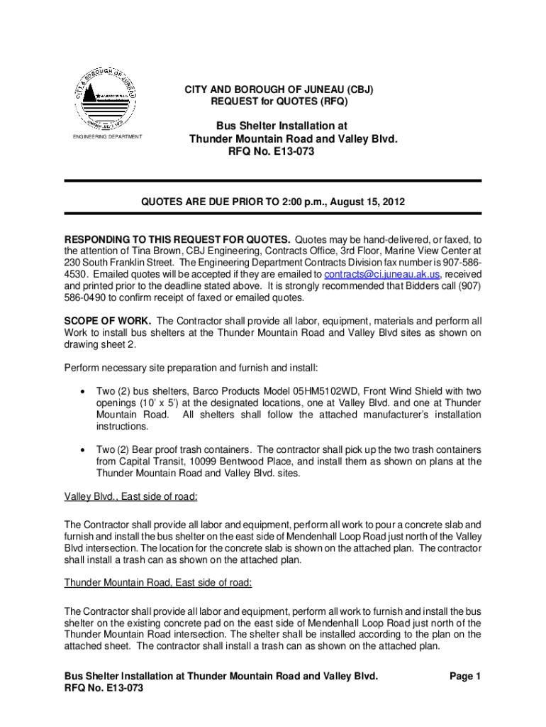 CITY AND BOROUGH OF JUNEAU (CBJ) REQUEST for QUOTES (RFQ)ENGINEERING Departments Shelter Installation at Thunder Mountain Road and Valley Blvd. RFQ No. E13073QUOTES ARE DUE PRIOR TO 2:00 p.m., August
