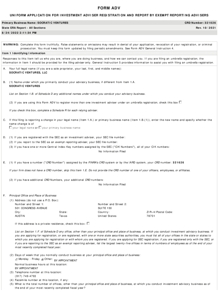FORM ADV UNIFORM APPLICATION FOR INVESTMENT ADVISER REGISTRATION AND REPORT BY EXEMPT REPORTING ADVISERS Primary Business Name: SOCRATIC VENTURES CRD Number: 321626State ERA Report All Sections Rev.