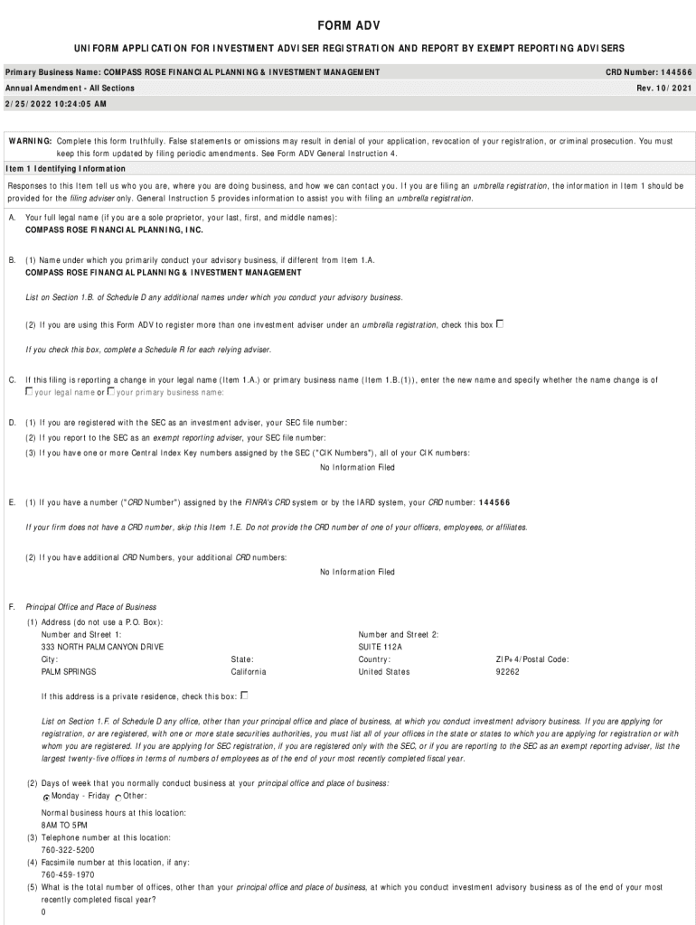 FORM ADV UNIFORM APPLICATION FOR INVESTMENT ADVISER REGISTRATION AND REPORT BY EXEMPT REPORTING ADVISERS Primary Business Name: COMPASS ROSE FINANCIAL PLANNING & INVESTMENT MANAGEMENT CRD Number:
