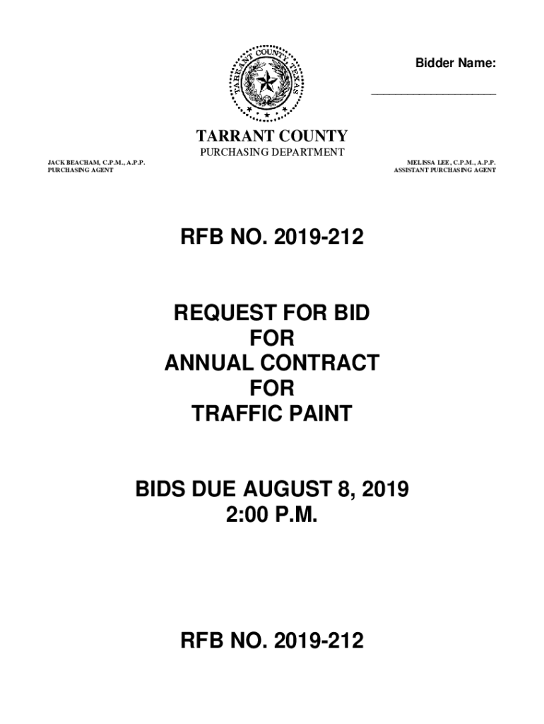 Bidder Name: ___TARRANT COUNTY PURCHASING DEPARTMENT JACK BEA CHAM, C.P.M., A.P.P. PURCHASING AGENTMELISSA LEE, C.P.M., A.P.P. ASSISTANT PURCHASING AGENT NO. 2019212REQUEST FOR BID FOR ANNUAL CONTRACT