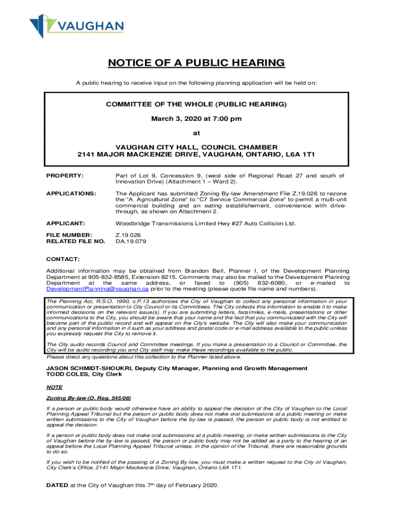 NOTICE OF A PUBLIC HEARING A public hearing to receive input on the following planning application will be held on:COMMITTEE OF THE WHOLE (PUBLIC HEARING) March 3, 2020, at 7:00 pm at VAUGHAN CITY