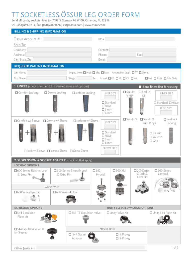 TT SOCIETIES SPUR LEG ORDER FORMS end all casts, sockets, files to: 7199 S Conway Rd #100, Orlando, FL 32812 tel: (888)8396213, fax: (800)7889878 | cs@ossur.com | www.ossur.com BILLING & SHIPPING