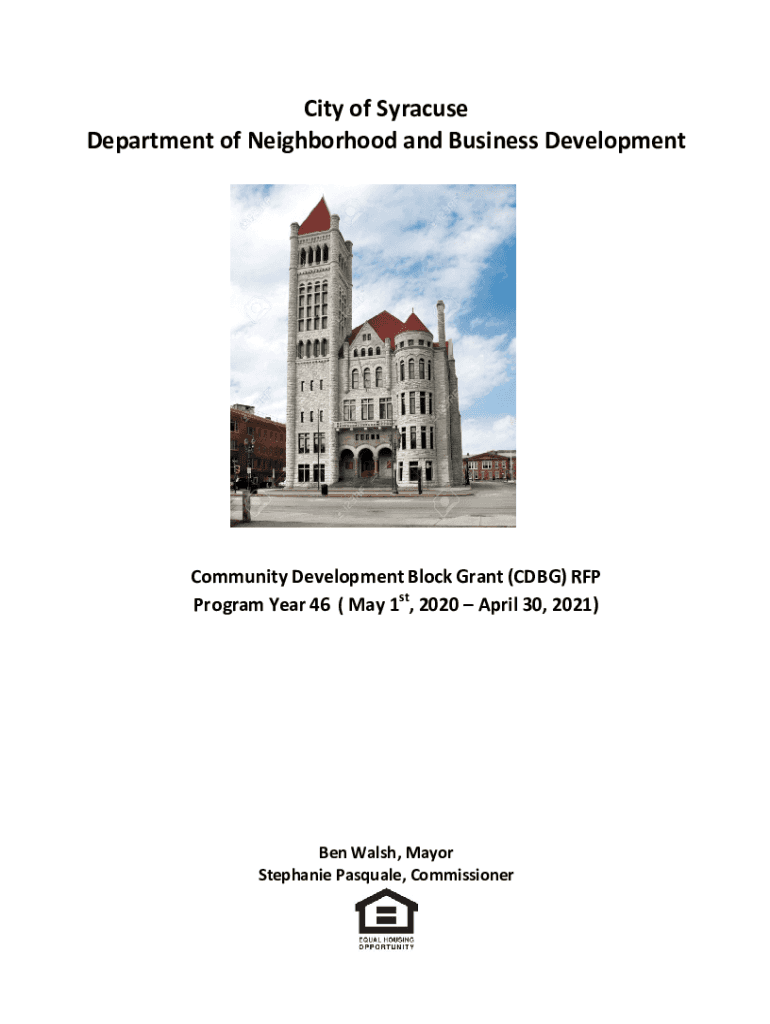 City of Syracuse Department of Neighborhood and Business DevelopmentCommunity Development Block Grant (CBG) RFP Program Year 46 (May 1st, 2020 April 30, 2021)Ben Walsh, Mayor Stephanie Pasquale, CommissionerApplication