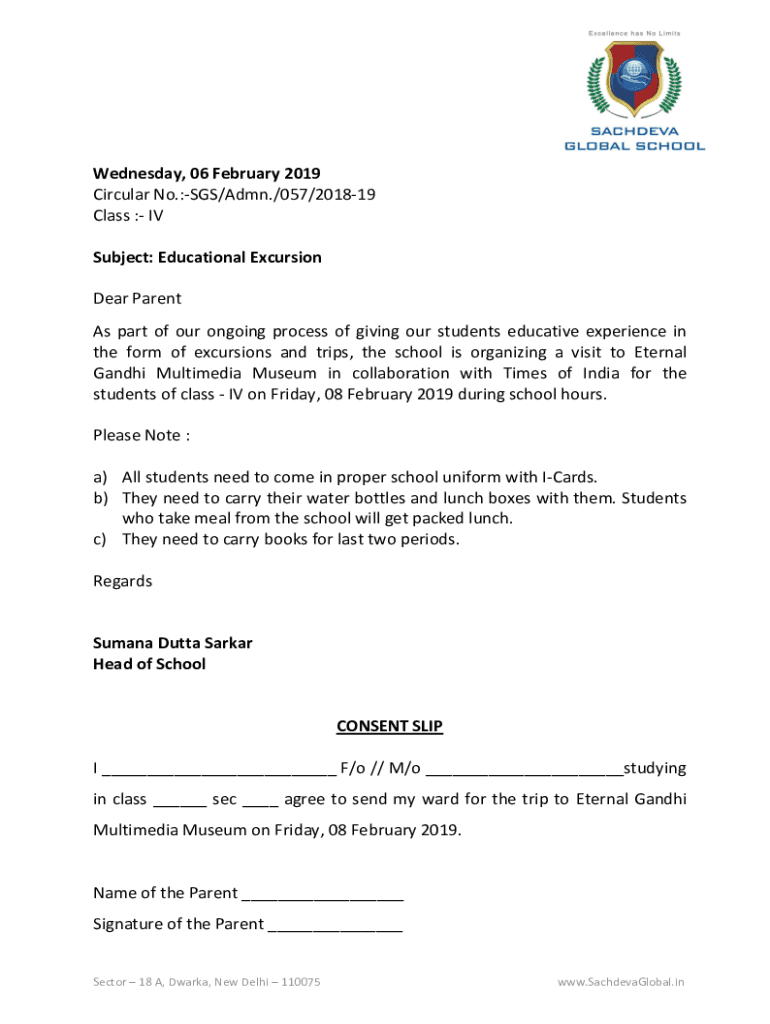 Wednesday, 06 February 2019 Circular No.:SGS/Aden./057/201819 Class : IV Subject: Educational Excursion Dear Parent As part of our ongoing process of giving our students educative experience in the